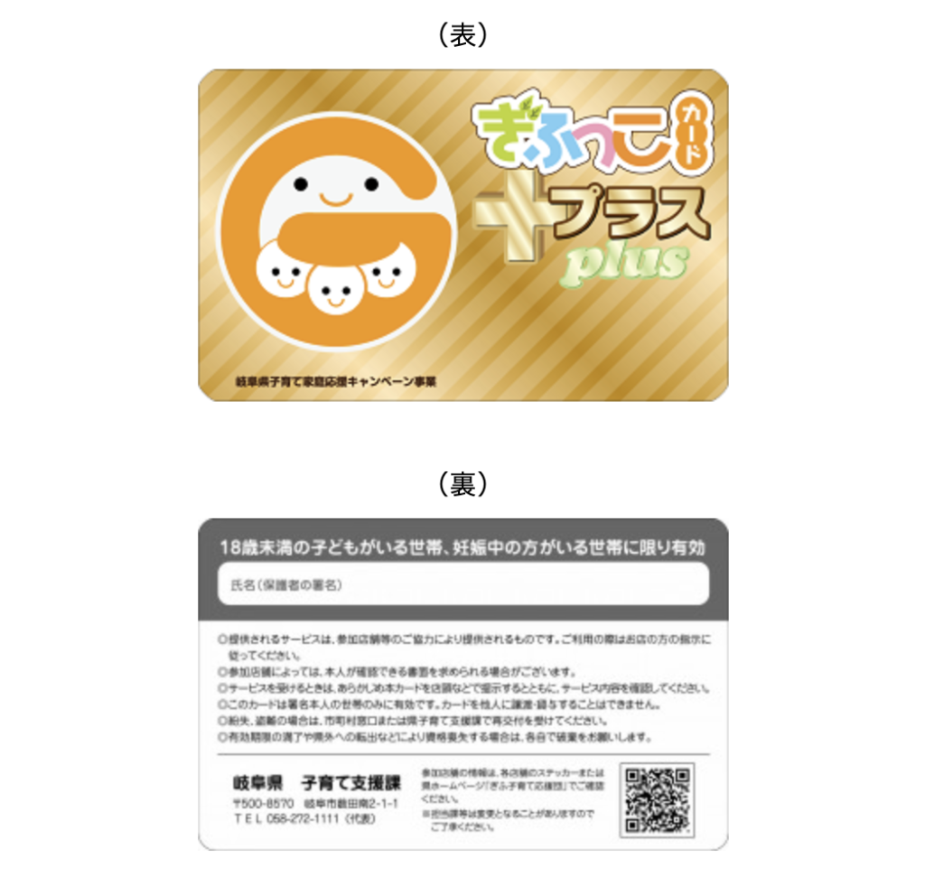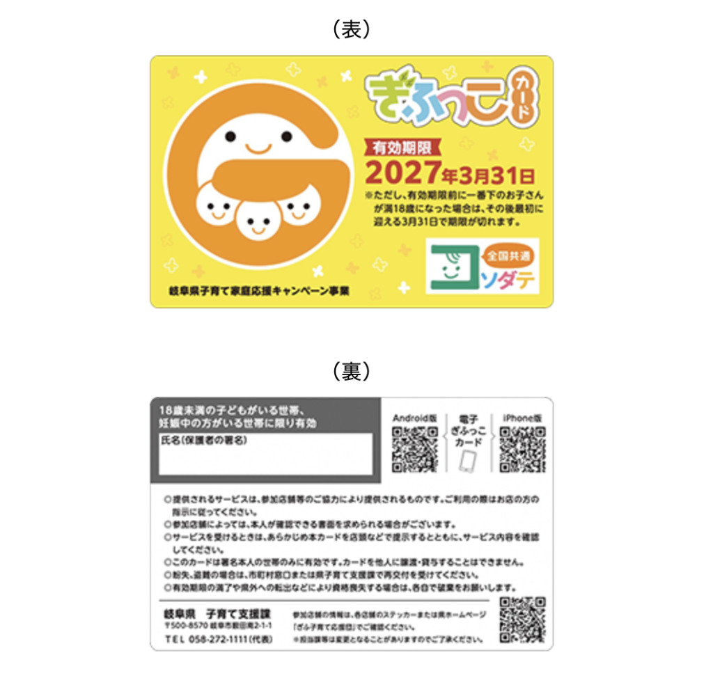 「ぎふっこカード」は岐阜県内に在住の18歳未満のお子さんがいる世帯や妊娠中の方がいる世帯に配布されます。