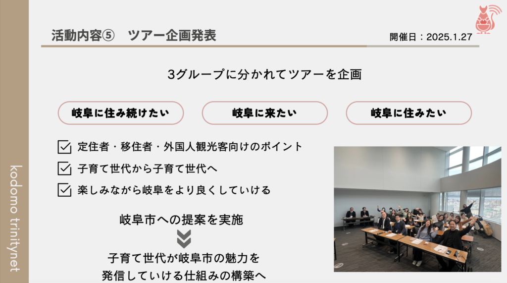 1月にはまちづくりの視点を大事に、3グループでツアーを企画し、岐阜市の方へ発表・提案を行いました。今後、子育て世代が岐阜の魅力を発信し続けられる持続可能な仕組みの構築を目指して活動を進めていきます。