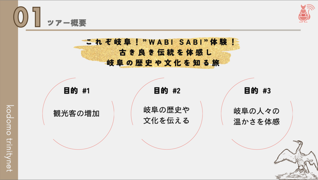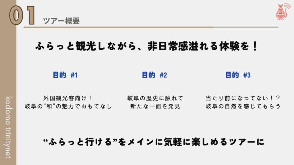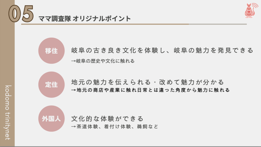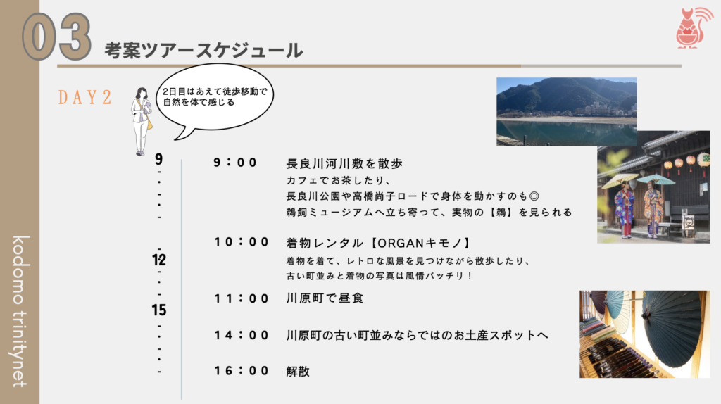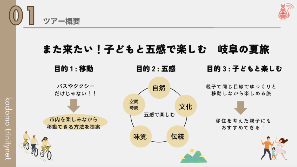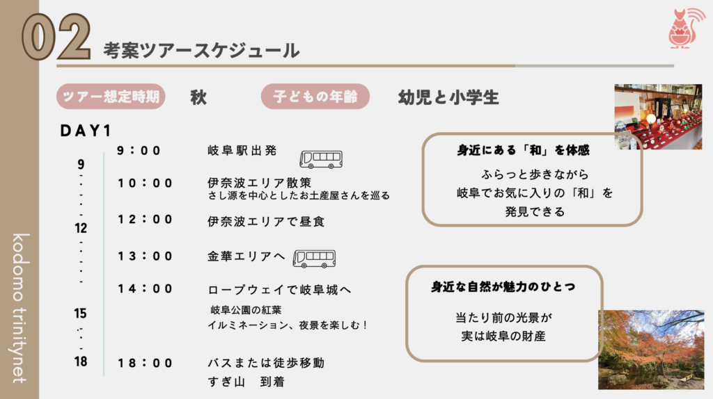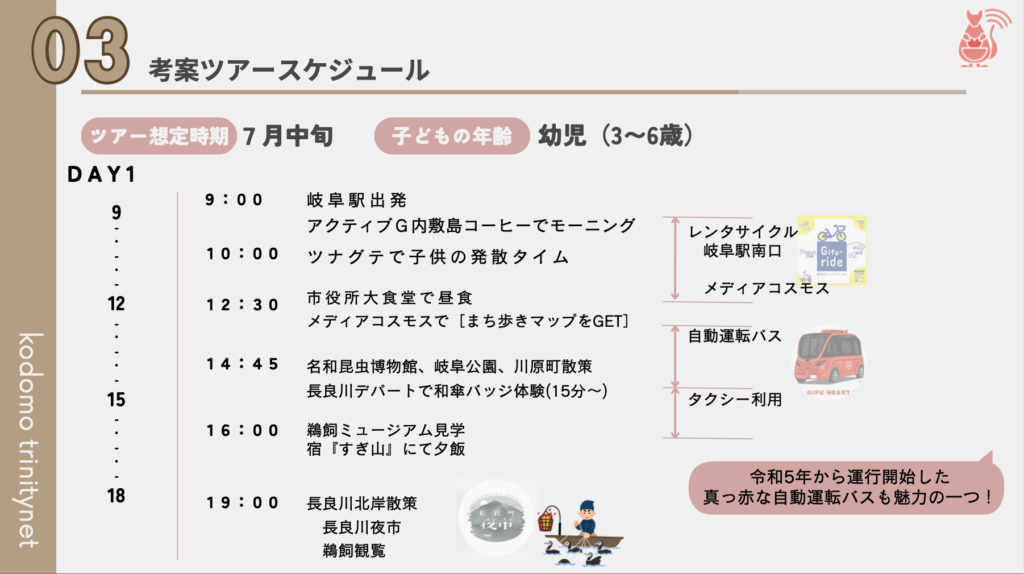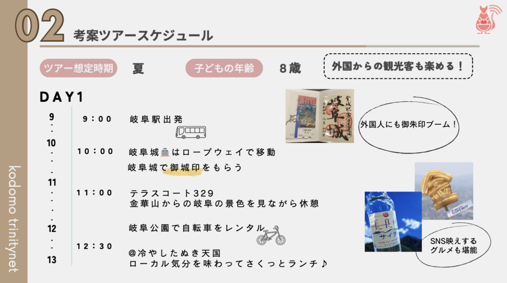 旅行を検討している方達が1から計画しなくても済むため、行き先を「岐阜にしよう」とスムーズに決断してくれるのではないでしょうか。“育児中のママたちが考えた“などターゲット層の目に留まるキャッチフレーズもあると、よりターゲット層に響くと思います。