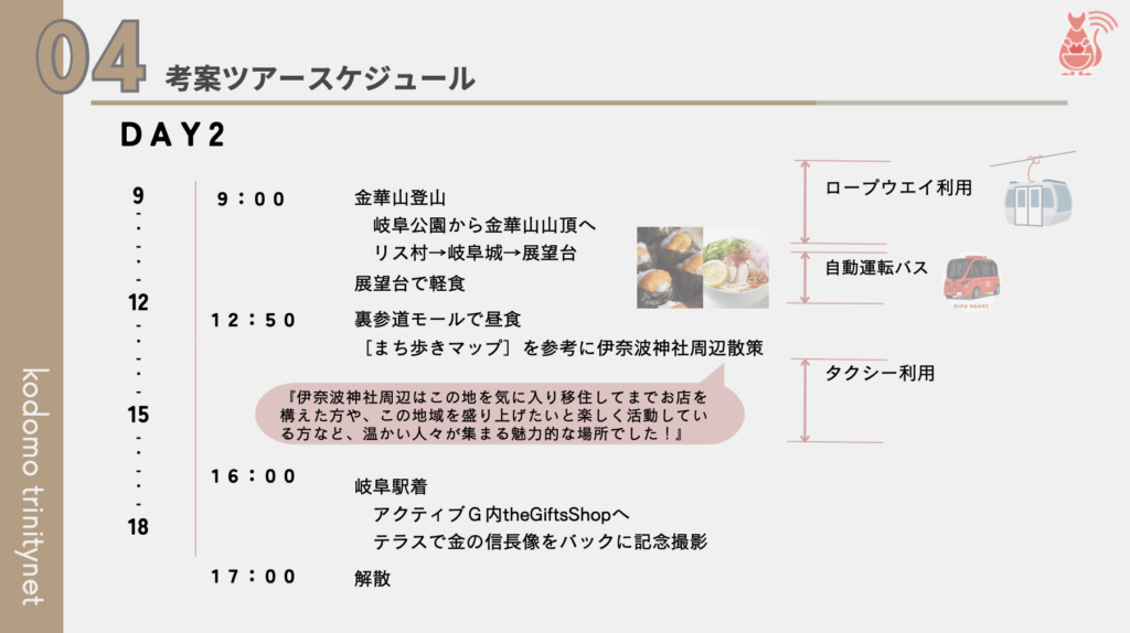 岐阜観光の移動は車がメインと思い込んでいる私たちも、あえて車を使わないから発見できるポイントを盛り込みました。子どもがワクワクする・隠れた岐阜グルメを知る・毎回違う楽しみ方ができる、、子どもも大人もツアー行程で次回行きたいお店や行きたい場所が見つかるような工夫をしました。