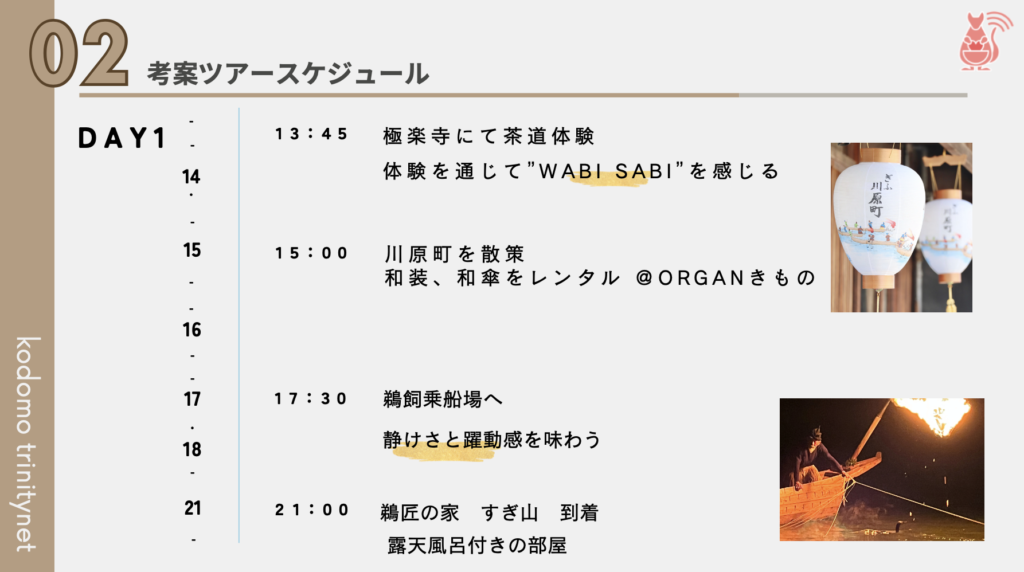 1グループ考案のツアーは夏💡子どもの年齢は8歳で小学校低学年くらいのファミリーを想定しています。外国人観光客をターゲットにしています。